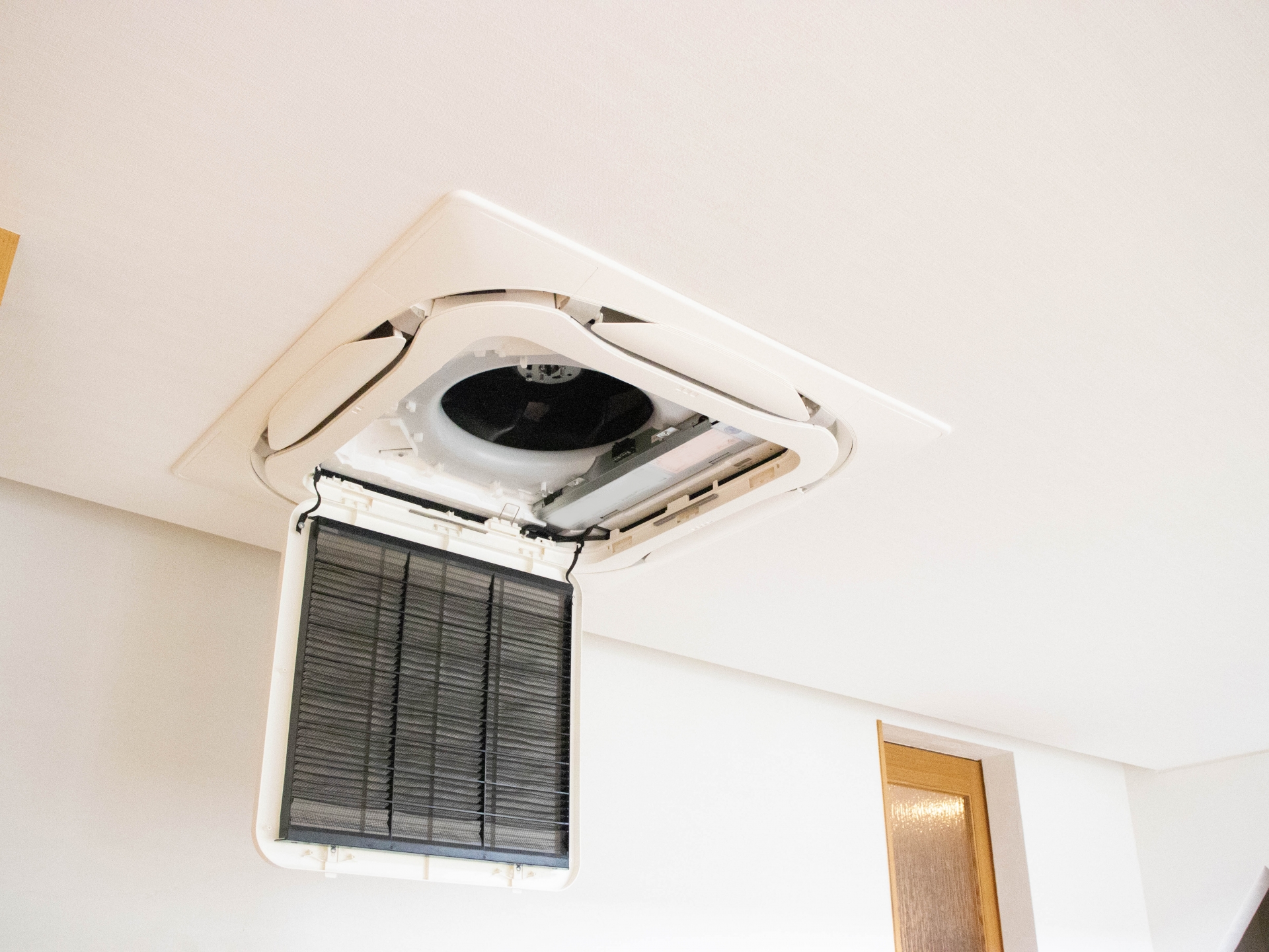 まずはフィルター掃除。空気中のホコリなどが吸い寄せられるフィルターは、エアコンの性能にも関わるので、キレイな状態することをおすすめします。天井埋込カセット形エアコンなどは、パネルの取り外しも簡単。掃除機でホコリを吸い取り、汚れ具合によって水洗いや中性洗剤を使用し、定期的なお手入れをしてください。
